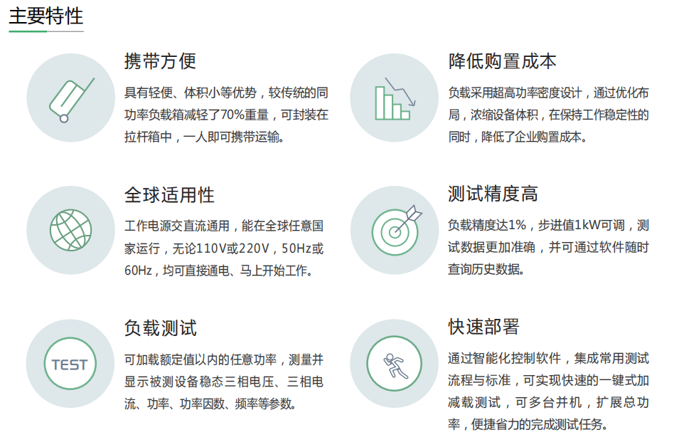 具有輕便、體積小等優勢,較傳統的同功率負載箱減輕了70%的重量,可封裝在拉桿箱中,一人即可攜帶運輸。